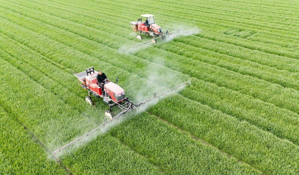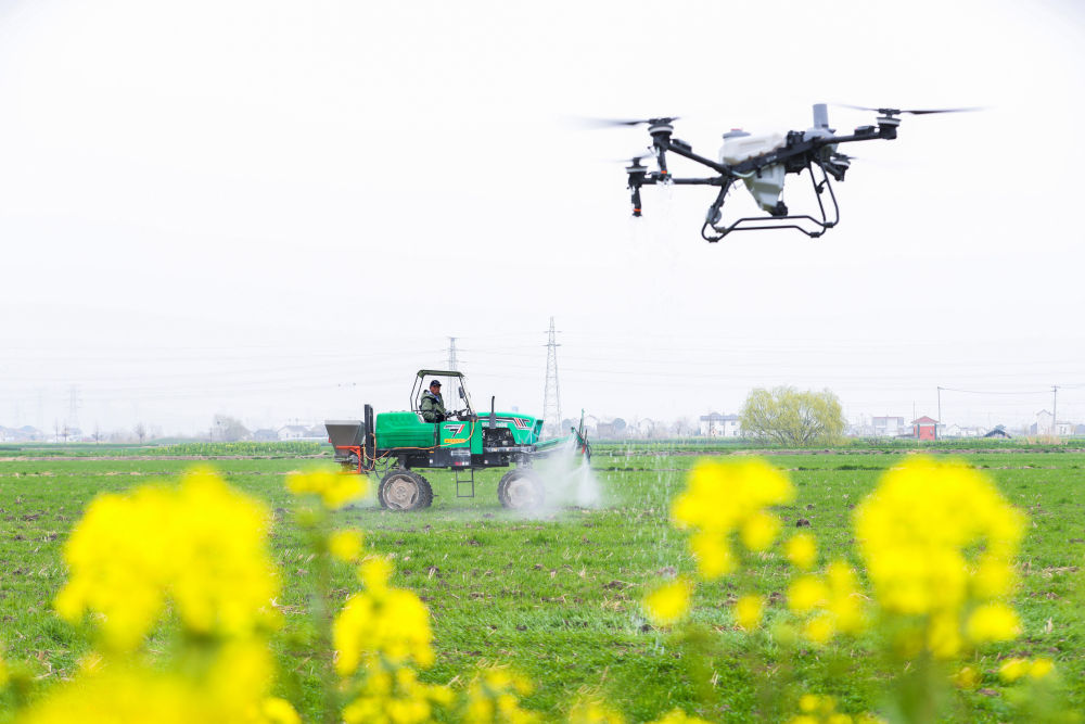 3月13日,在江苏省兴化市陈堡镇蒋庄村,农民驾驶植保无东谈主机、自走式喷杆喷雾机实践杂草防治功课。新华社发