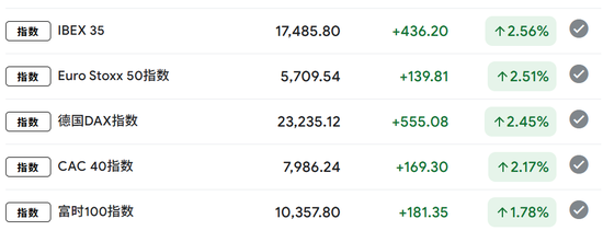 与此同期,A股收盘之后,欧洲股市也在暴涨!德国、法国、英国涨幅均在2%傍边。