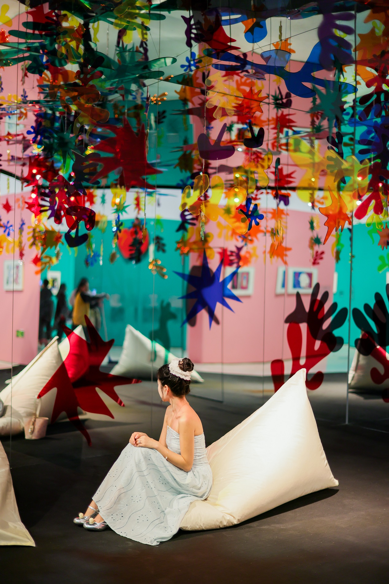为破损艺术与群众的壁垒,展览悉心设立了11处千里浸式打卡点与互动体验区。在蓝白雕琢展陈旁,在《跳舞》整墙彩色灯光安装前、在镜面安乐椅躺平区中、不论是情侣约聚、闺蜜打卡,一经亲子遛娃、孤立放空,王人能千里浸式感受颜色的情谊与活力,随意拍出刷爆一又友圈的艺术大片。