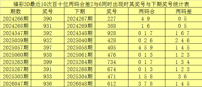百十位合差分析:上期奖号百十位开出93组合,两码合为2,两码差为6,最近10次百十位两码合2与两码差6同期出当前,其奖号和下期奖号诀别为: