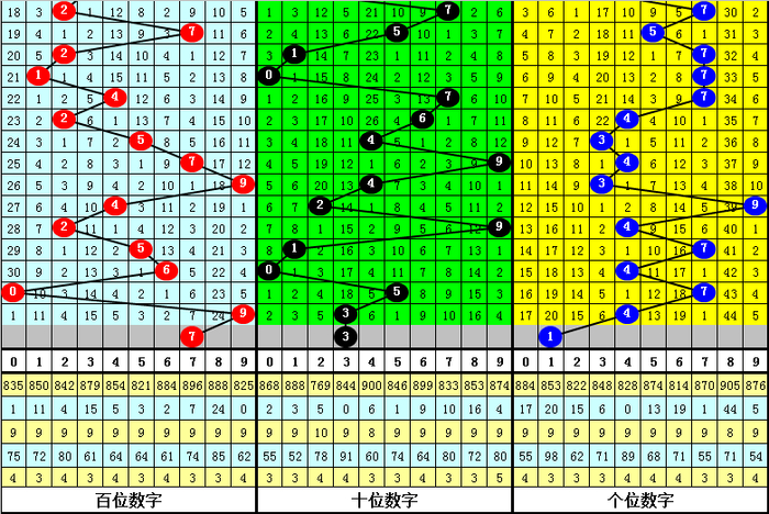 百个位合差分析:上期奖号百个位开出94组合,两码合为3,两码差为5,最近10次百个位两码合3与两码差5同期出当前,其奖号和下期奖号诀别为: