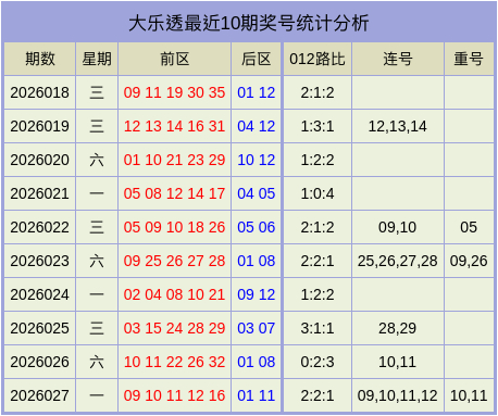 前区012路比为2:2:1,三区比4:1:0,奇偶比为2:3,开出3组连号09,10,11,12,开出2枚重号10,11。